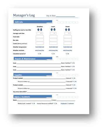 One other major advantage to using a Manager’s Log is having information gathered into one easily accessible location for you use for your other reports. From the information gathered in the Manager’s Log, you can create a history of food or alcohol sales per shift, track your customer counts for each meal period into a spreadsheet, or update employee personnel files.