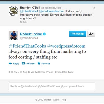 I tweeted a link of my article to Robert Irvine and apparently he read it because he tweeted back to directly answer my most pressing questions. Here is our Twitter conversation, and make sure you are reading my own tweets back to keep everything in context. Also, I believe in full disclosure. I am a fan of the show, though it does not reflect the type of work I do with restaurants, and I appreciate Robert’s willingness to engage his fans.